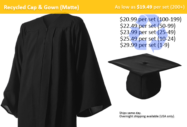 Recycled caps and gowns look and wear just like our regular Matte caps and gowns but, instead of being polyester, they are made from 24 recycled plastic bottles!